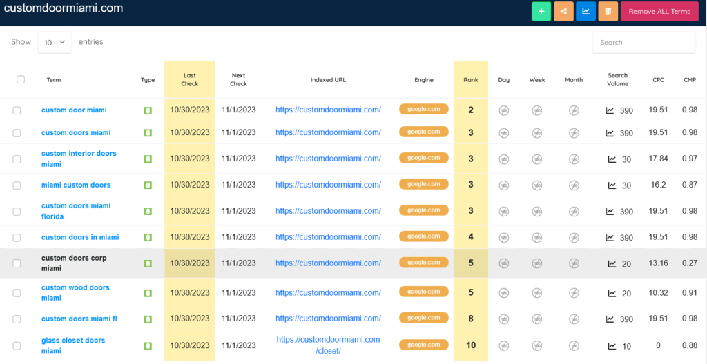 In the above chart, we are using Xagio Rank Tracker. We see 8 Keywords that are ranking on the 1st page of Google. You can also see Google’s stats for search volume and Cost Per click. Google is telling us that for the keywords listed there is an associated monthly search volume and that a Google ads campaign is willing to pay $X amount of dollars to have someone click on a link that is associated with that keyword. As an example from the chart, we see the keyword, “Custom Door Miami” gets 390 Searchers per month and the ad cost is $16.76 per click. We can also see that “Custom Interior Doors miami” has no associated search volume and therefore no Cost per click associated with it, yet we are still ranking for it. You will also noticed how the page has managed to move in rankings over time for all of the keywords. For example, “custom doors miami florida” last month was ranked 23 and now ranking 4. This shows you that this page has been organically “percolating”, so to speak, on Google and its rankings are getting better for the above listed keywords. We are only showing you the 1st page keyword rankings, however this page is ranking for over 56 other keywords that have the potential to move up in rank.