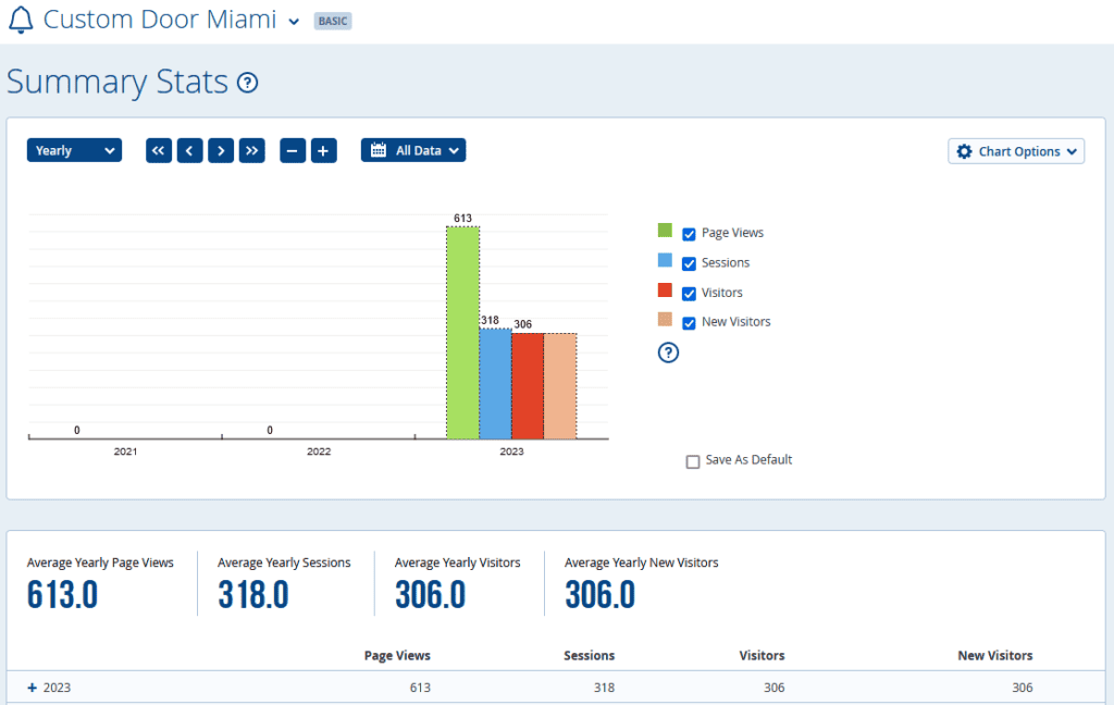 The above chart shows that this site is ranking for 10 different keywords all within the top 10 positions on Page 1 of Google. (Please note, we lost the keywords that we had in the system and had to reintroduce them. This is why you dont see the Columns of Day, Week and Month with any info in them. However, we do have the stats from the 8/9/2023 Ranking stats which you can find below). As per Google, the total Monthly search volume for these keywords equals 2,060 (Total of the Search Volume Column). And the value of these Keywords is equal to $155.07 per click within Google Adwords (Total of the CPC column). That means that businesses are spending the specified amount per keyword click on Google Adwords. To show this better, the keyword “Custom Door Miami”, ranking #2 on Google, is costing a business $19.51 everytime someone clicks on that Google Ad for that specific keyword phrase. What our site is doing is getting FREE organic advertising by ranking on the 1st page of Google for these specific keywords as we dont have to advertise on Google Adwords to generate clicks. We also are ranking for 9 other keywords on the first page creating a HUGE savings as we dont have to pay for each of these keyword campaigns in Google Adwords. The next chart shows Visitor page views to the site using Statcounter.