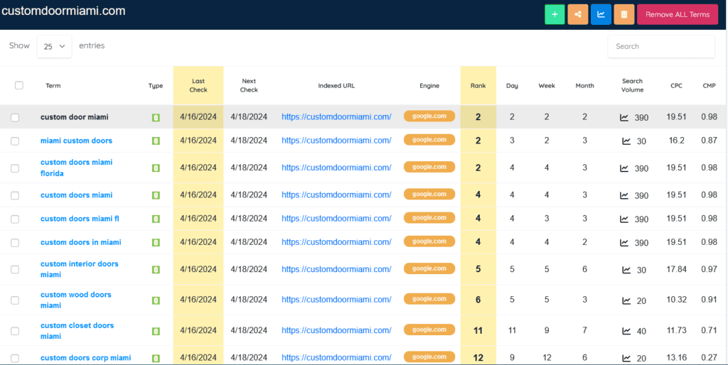 Welcome and thank you for taking the time to review this page. You were given access to this private page link in order to review the statistics of this sites domain, customdoormiami.com . We will be updating this page accordingly and dating our information. On this page you will find the Current Ranking Keywords and Positions, Search Volume, Cost Per Click and Summary Stats for the sites Page Views. The purpose is to show the value that this site provides when compared to other means of marketing such as your companies current Website, Google Adwords, Facebook marketing, etc. It is designed to act similar to a landing page but with more specific information. This particular site was optimized to rank on Google for Local SEO within the 1st page and the goal is to get the site ranking within the top 3 positions for specific keywords.