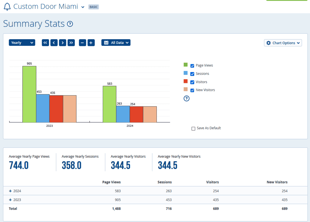 The above chart shows the Statcounter information. This domain has been online since August of 2023 and has been able to rank Organically within a few months. During that time, Statcounter has been measuring Page Views and is showing how many Average Page Views, Sessions and Vistors per year based on this current data. This statistic will only get better in time especially when the site is even further optimized to your specific business.